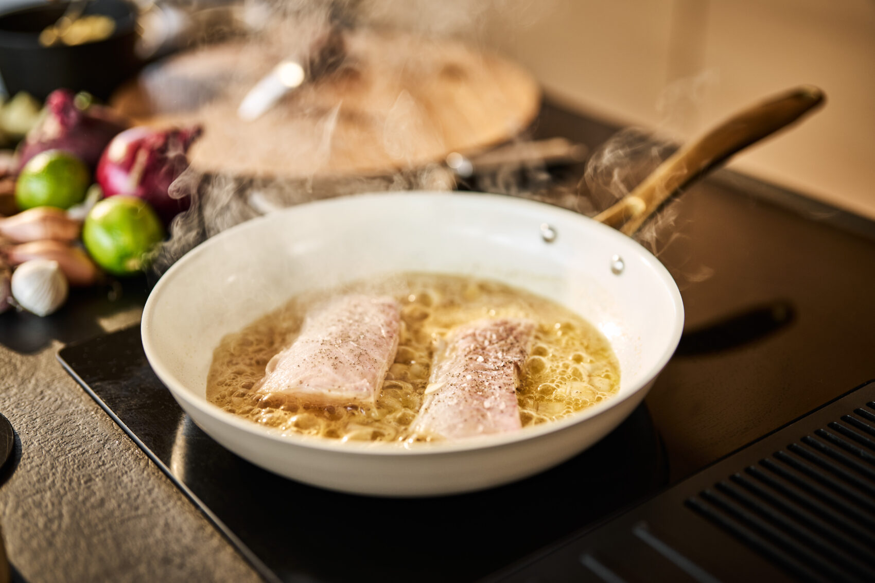 • Snu fisken på den andre siden og stek videre. Dryss over finhakket sjalottløk og la fisken steke ca . 30 sekunder til. Ha på fløte og kok i ca 1 minutt.