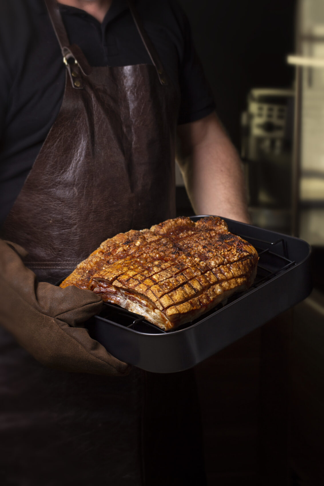 • Rut nå svoren i et fint mønster. Svoren er myk og fin og lett å rute nå. Stek videre i halvannen time på 180 °C med 20% damp. Pass på å helle på ca 1 liter med vann underveis, så det hele tiden er fuktighet i langpanna. Hell så av stekesjy og løk i en god brun saus.